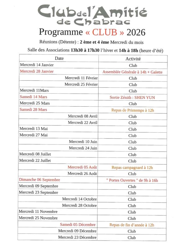 Club de l’amitié ! découvrez le programme « CLUB » 2026