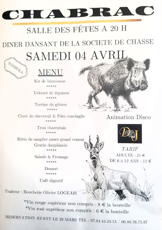 La société de chasse de Chabrac organise son traditionnel diner dansant le samedi 4avril à 20h à la salle des fêtes. Réservation avant le 28 mars tél: 07.84.44.24.13 / 06.88.76.75.97