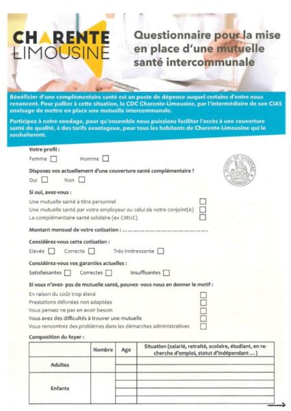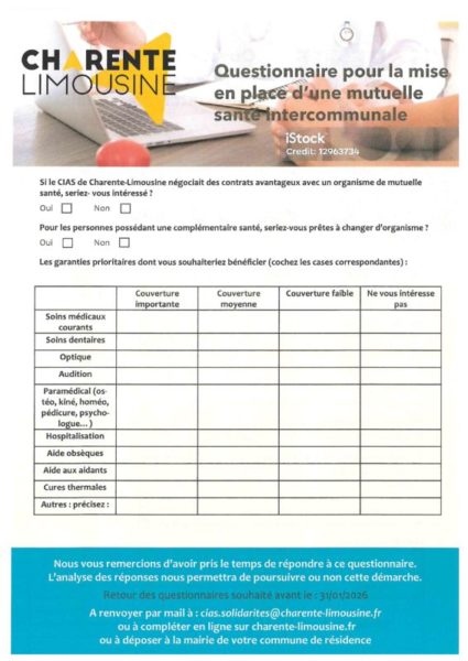 L’analyse des réponses permettra de poursuivre (ou pas) cette démarche. A renvoyer par mail à : cias.solidarites@charente-limousine.fr ou à déposer à la mairie de Chabrac, ou encore à compléter en ligne sur charente-limousine .fr